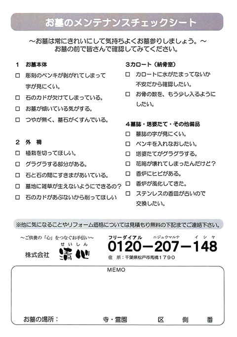 お墓参りの際に「メンテナンスチェックシート」をご利用いただけます。
